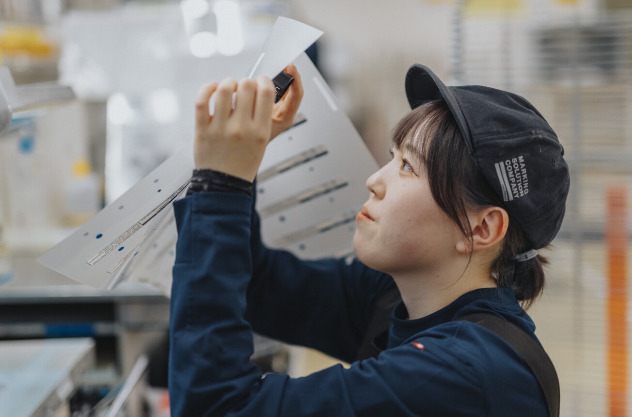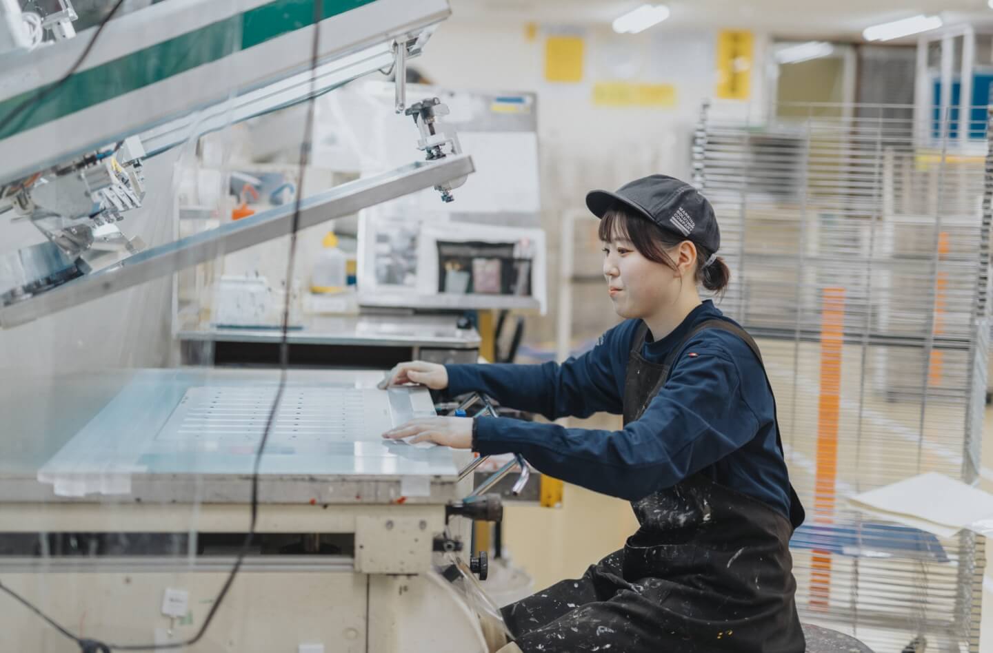 熱転写ラベルの製造を行う第一製造部で、印刷を担当しています。お客様からいただいたデザインを、色ごとに作った版で1色ずつ印刷し、ラベルにしていく作業です。